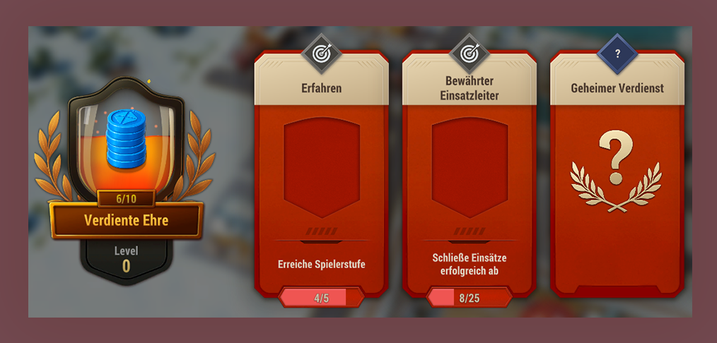 Diese Verdienste bleiben verborgen, bis du sie freischaltest. Probiere unterschiedliche Aktivitäten aus und entdecke alle Bereiche des Spiels – du weißt nie, was sich als geheimer Verdienst entpuppen könnte.